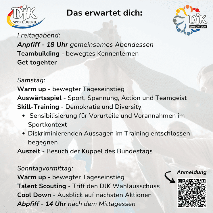 Das Juniorteam der DKJ Sportjugend lädt alle DJKler*innen zwischen 16 und 26 Jahren zu einem spannenden Wochenende mit Teambuilding, Workshops und spannenden wie sportlichen Aktivitäten ein.