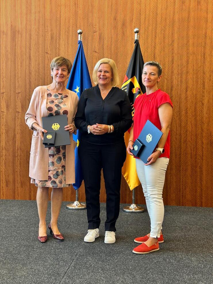 Elsbeth Beha (links) und Katrin Braun (rechts) bei der Verleihung des Bundesverdienstkreuzes durch Bundesinnenministerin Nancy Faeser.