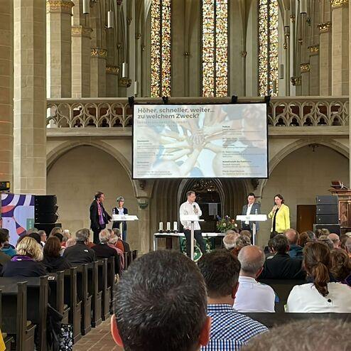 Am Samstagnachmittag wurde es dann ernst in der Predigerkirche. Bei der Diskussion „Schneller, höher, weiter… zu welchem Zweck?“, moderiert von Hajo Seppelt, debattierten prominente Gäste wie Staatssekretärin Juliane Seifert, Bischof Dr. Stefan Oster und Sylvia Schenk von Transparency International Deutschland. Dabei ging es um die Ethik im Sport und die Frage, wie weit man im Streben nach Rekorden und Höchstleistungen gehen sollte.