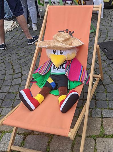 Neben dem Wettkampfbetrieb am Samstag war die Inklusive Sport- und Spielemeile von 10 bis 16 Uhr am 4.6.2022 in der Schwabacher Innenstadt ein Highlight der DJK-Sportjugend in Kooperation mit der Bundeszentrale für gesundheitliche Aufklärung (BZgA). Hier hatte Carlitos es wirklich sehr bequem, denn die DJK Sportjugend reservierte ihm wieder einen Platz in ihrem gemütlichen Sportjugend-Klappstuhl mit erstklassiger Lage: Mitten auf dem Schwabacher Markplatz gegenüber des Rathauses mit dem schönen goldenen Dach. Hier traf er auch auf bekannte Gesichter: Thomas Jung von Adveniat stellte vor Ort die Kooperation von Adveniat und der DJK vor und DJK-Präsidentin Elsbeth Beha begrüßte Carlitos herzlich.