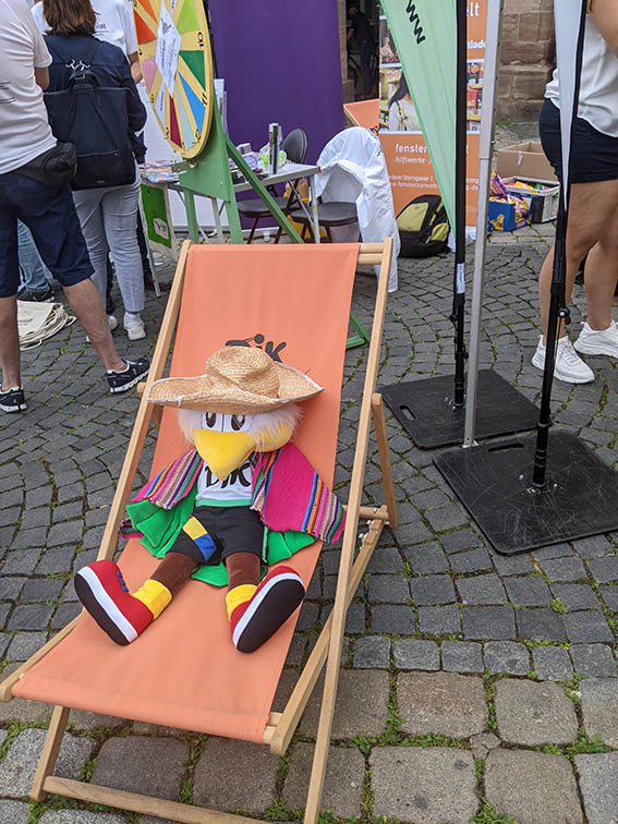 Neben dem Wettkampfbetrieb am Samstag war die Inklusive Sport- und Spielemeile von 10 bis 16 Uhr am 4.6.2022 in der Schwabacher Innenstadt ein Highlight der DJK-Sportjugend in Kooperation mit der Bundeszentrale für gesundheitliche Aufklärung (BZgA). Hier hatte Carlitos es wirklich sehr bequem, denn die DJK Sportjugend reservierte ihm wieder einen Platz in ihrem gemütlichen Sportjugend-Klappstuhl mit erstklassiger Lage: Mitten auf dem Schwabacher Markplatz gegenüber des Rathauses mit dem schönen goldenen Dach. Hier traf er auch auf bekannte Gesichter: Thomas Jung von Adveniat stellte vor Ort die Kooperation von Adveniat und der DJK vor und DJK-Präsidentin Elsbeth Beha begrüßte Carlitos herzlich.