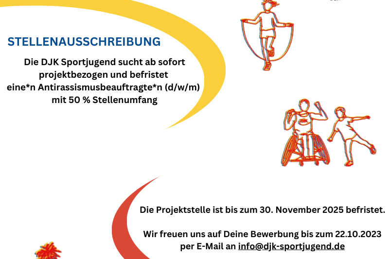 Die DJK Sportjugend sucht ab sofort projektbezogen und befristet eine*n Antirassismusbeauftragte*n (d/w/m) mit 50 % Stellenumfang