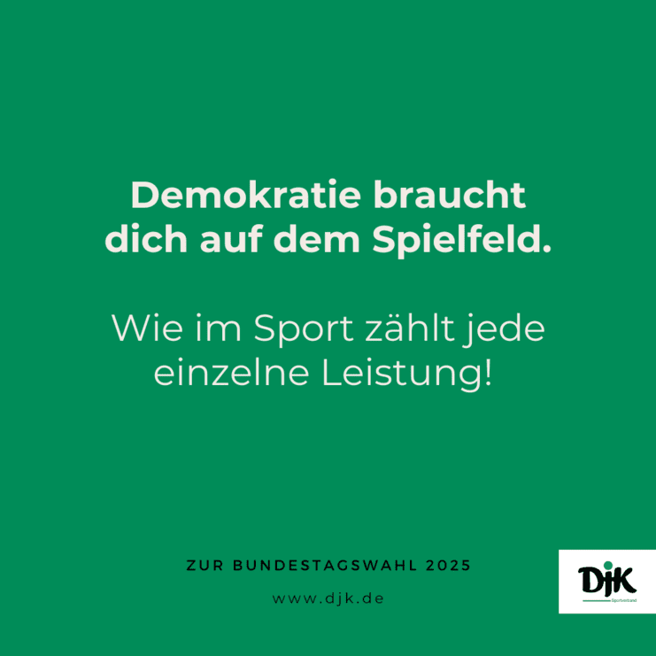 Der DJK-Sportverband schließt sich dem Wahlaufruf des Deutschen Olympischen Sportbundes (DOSB) an und ruft alle wahlberechtigten Bürger*innen dazu auf, am 23. Februar ihre Stimme abzugeben. Gemeinsam mit dem organisierten Sport in Deutschland stehen wir für eine demokratische, solidarische und weltoffene Gesellschaft – Werte, die wir im Sport tagtäglich leben und vermitteln.