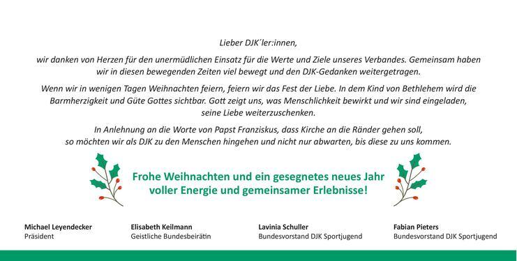 Zur besinnlichen Zeit möchten wir euch mit der Botschaft der DJK-Weihnachtskarte erreichen, die sowohl Dankbarkeit als auch Inspiration für das kommende Jahr mit sich bringt: